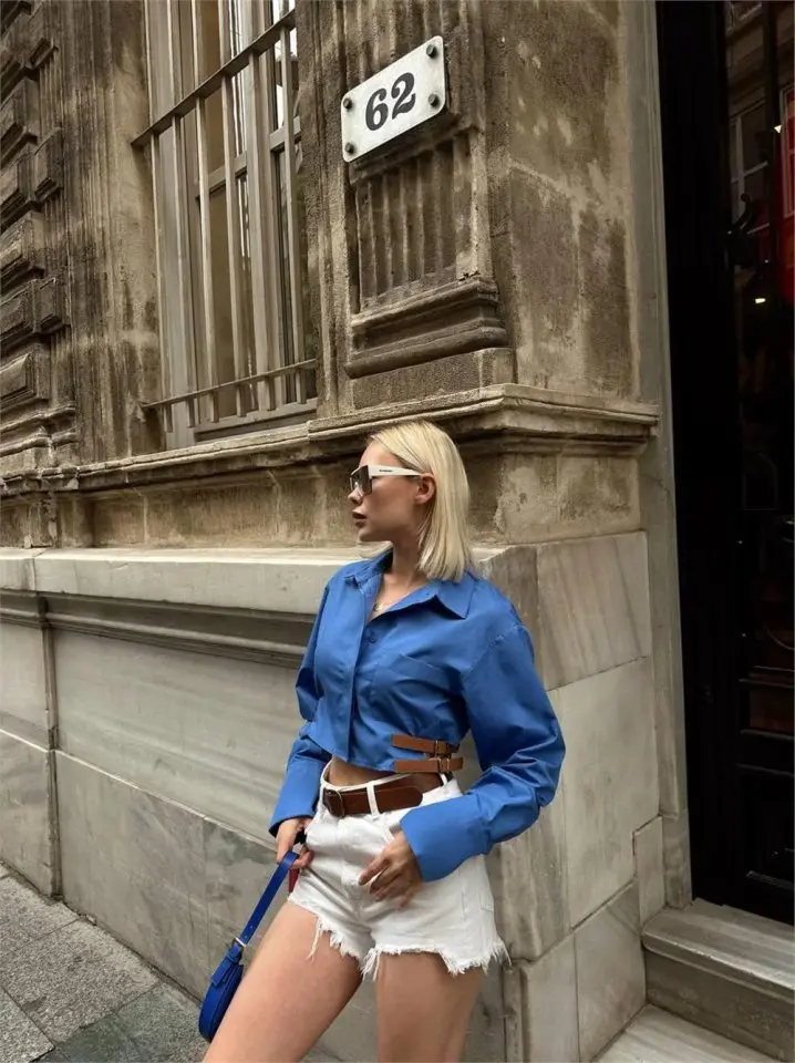 GÖMLEK POPLİN CROP YAN ÇİFT KEMER DETAYLI - Mavi