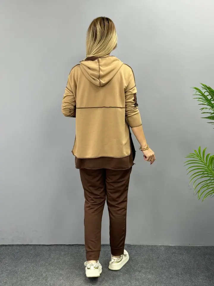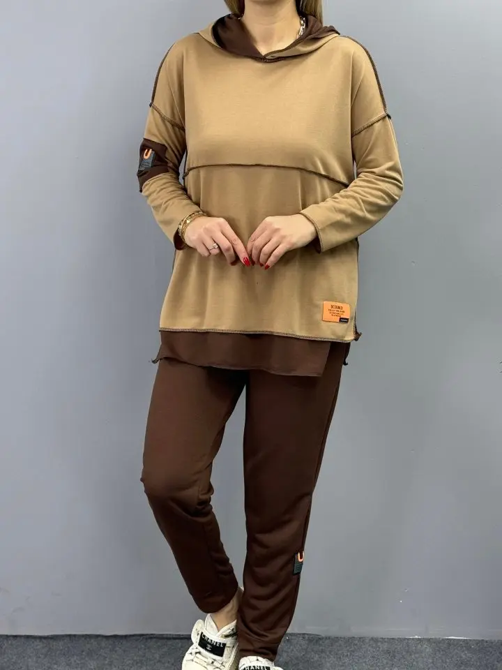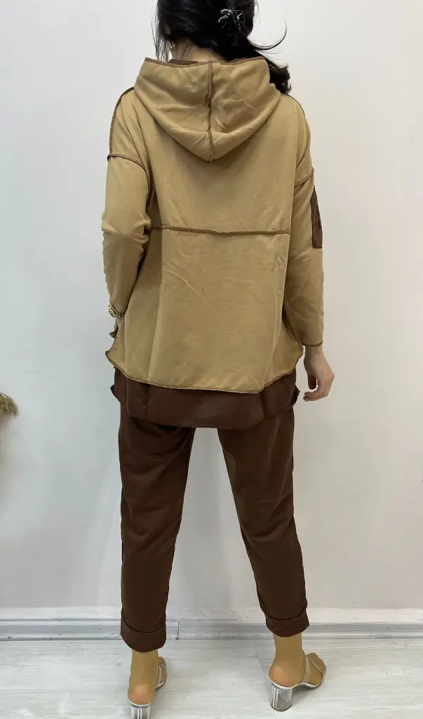 Kadın Kahve Kapşonlu Etek Ucu Detay Arma Ters Dikiş Gorunumlu Ikili Takım