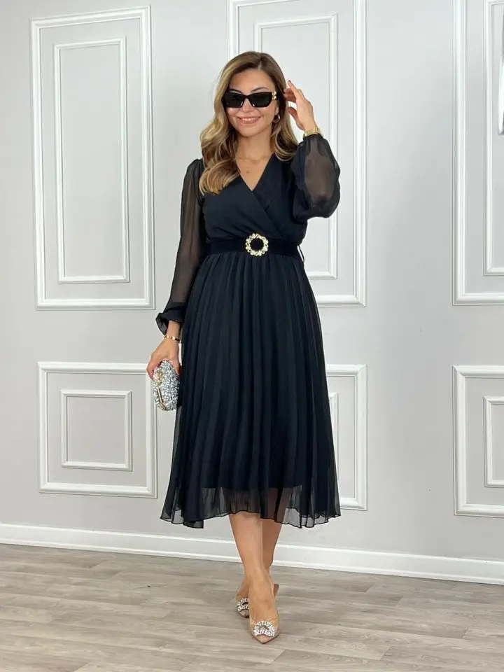 Kadın şifon Kumaş Astalı Kloş Kesim Kruvaze Yaka Midi Boy Elbise