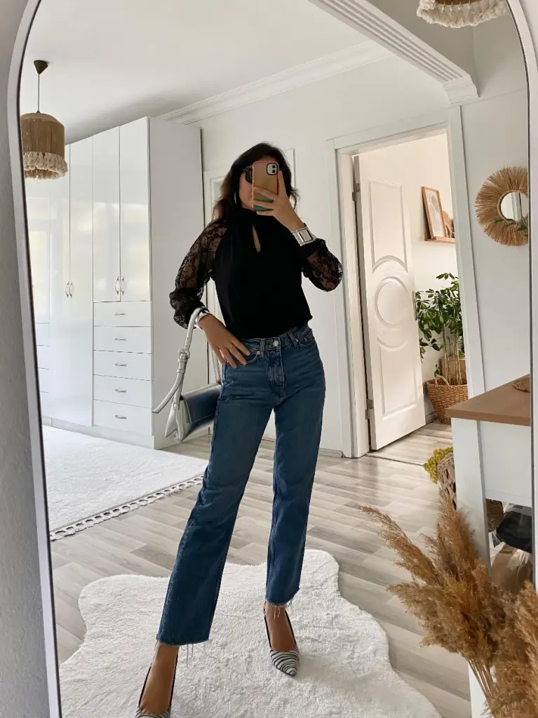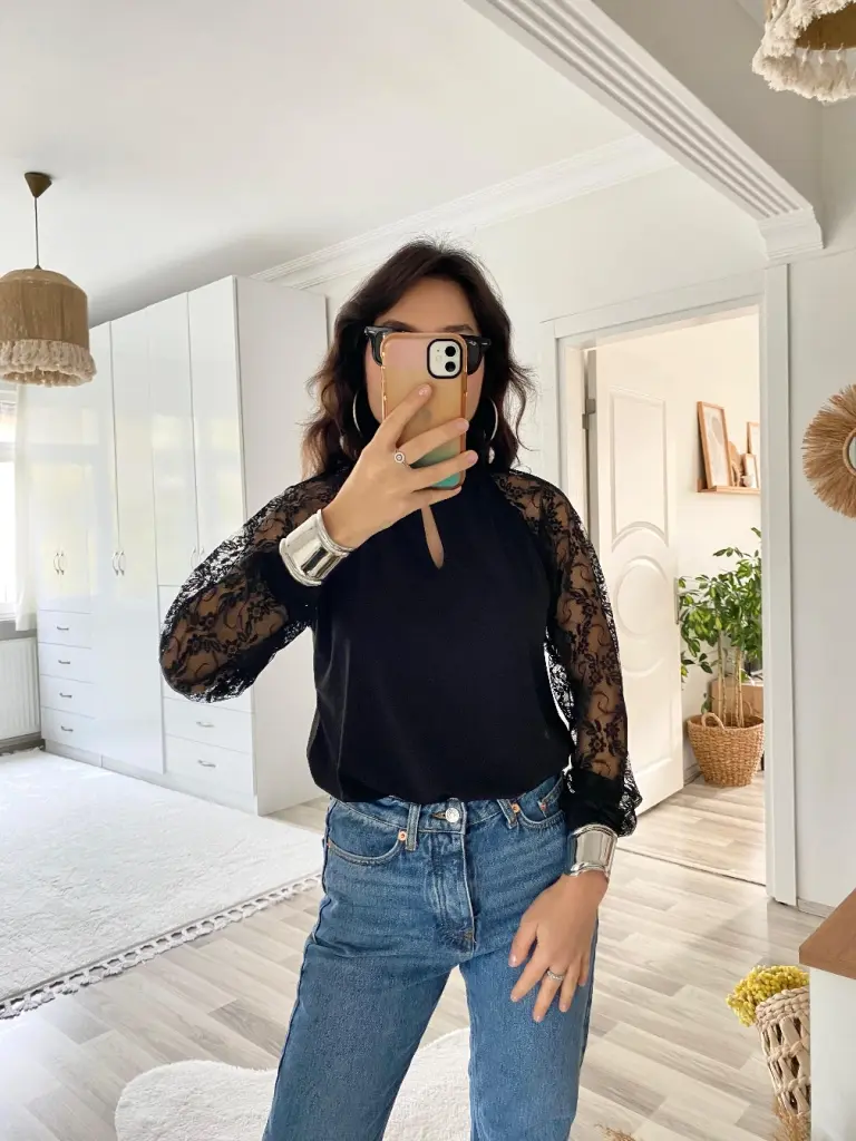 Kadın Uzun Kollu Göğüs Pencere Detay Yaka Boğazlı Kolları Tüllü Sandy Bluz