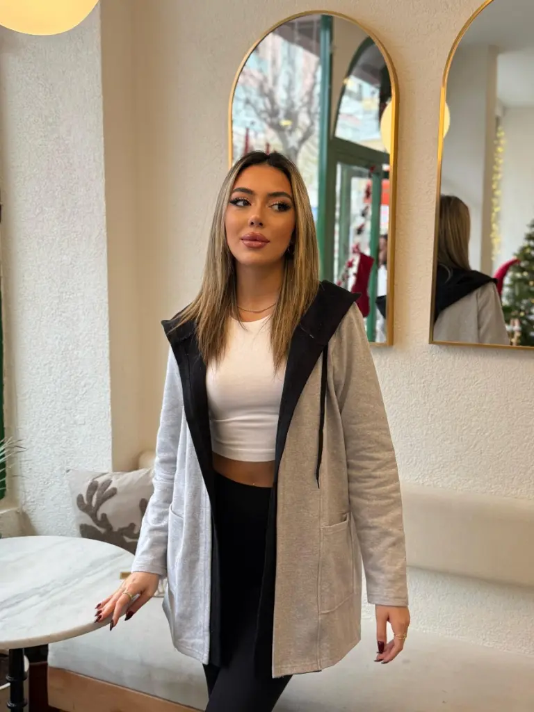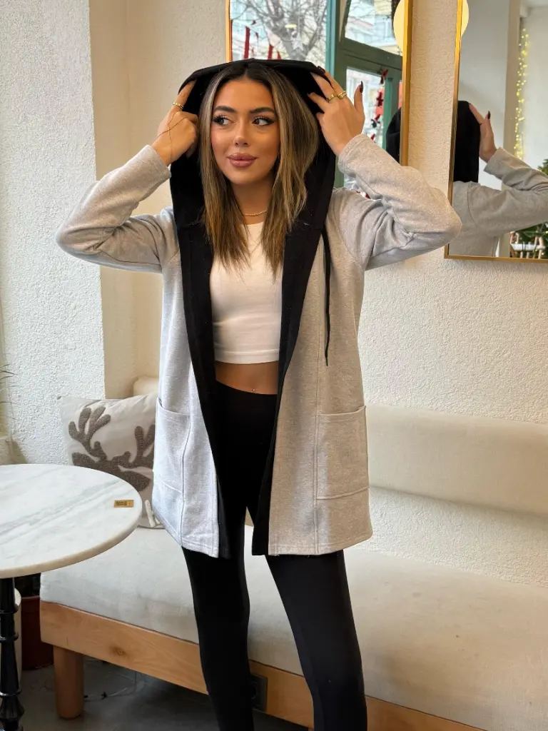 Kadın Uzun Kollu Kapşonlu çift Renkli şardonlu Iki Iplik Ceket