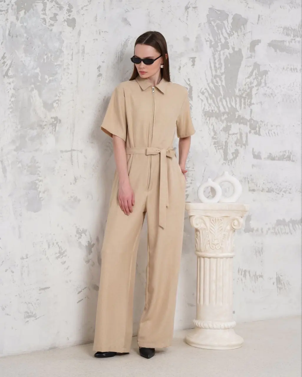 Kuşaklı gömlek yaka salaş tulum bej s255822