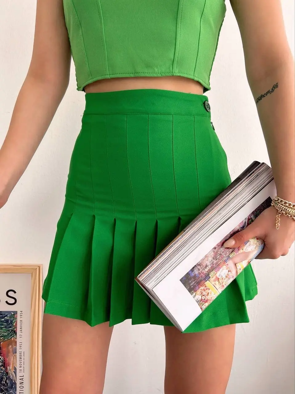 Pileli düğmeli etek açık yeşil s24811