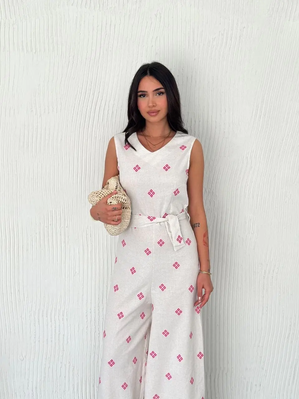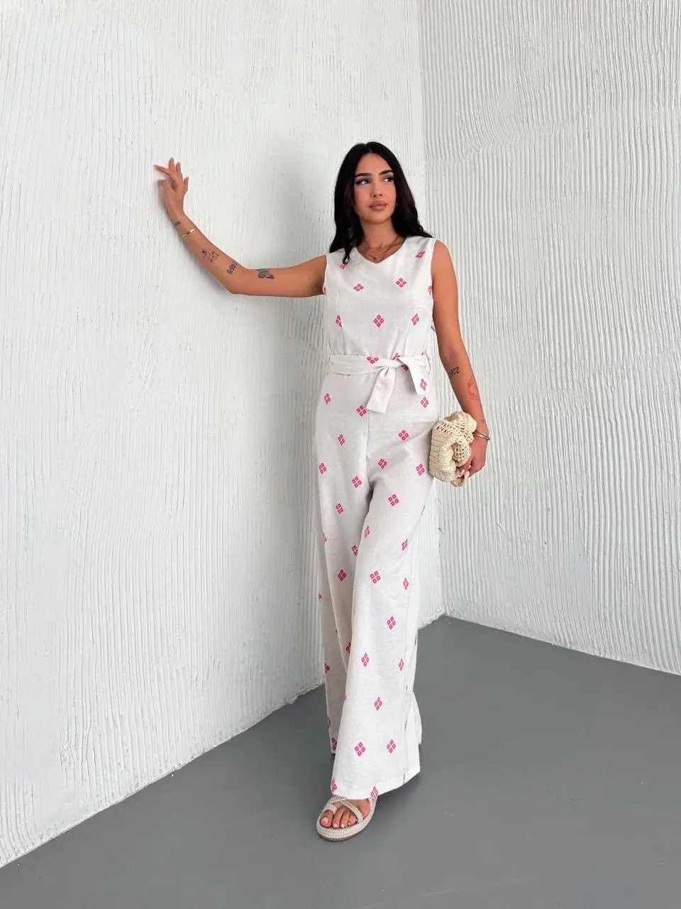 Sırt dekolteli keten beyaz tulum S1036