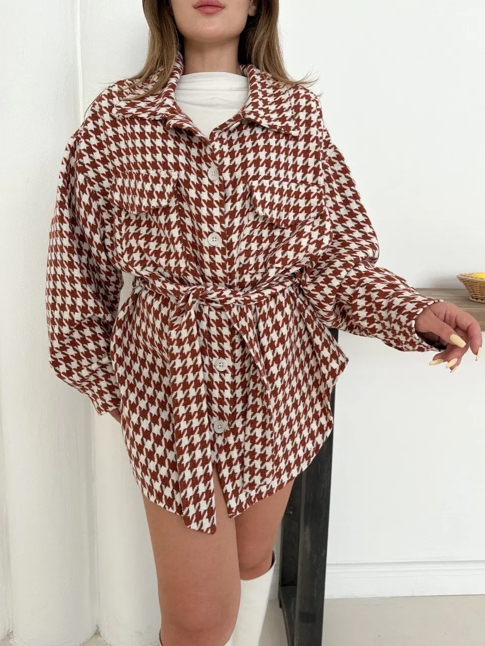 Uzun kaşe gömlek beyazkremit st255812