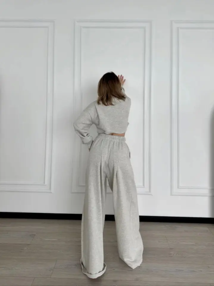 Uzun Kollu Önü İp Büzgülü Crop Ve Pantolon İkili Takım - Gri