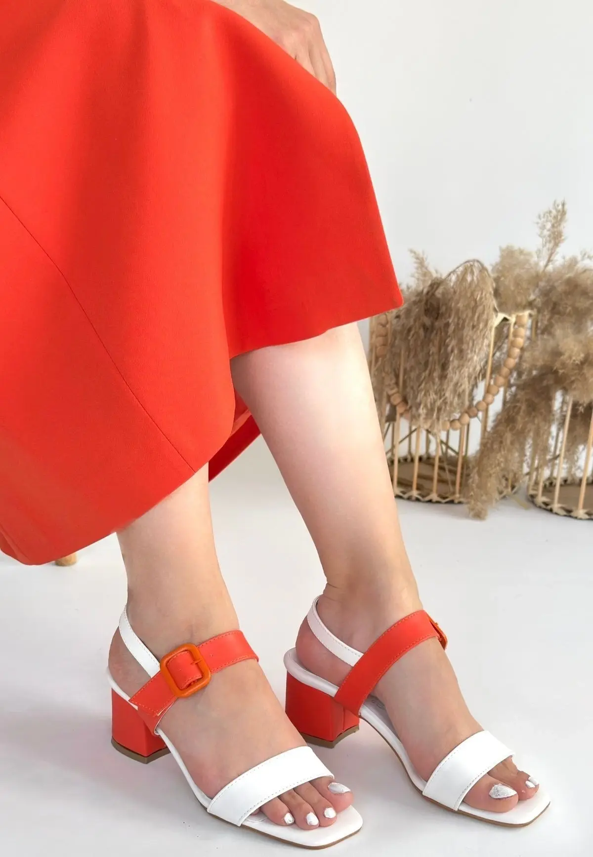 Year Beyaz Cilt Turuncu Detaylı Topuklu Ayakkabı