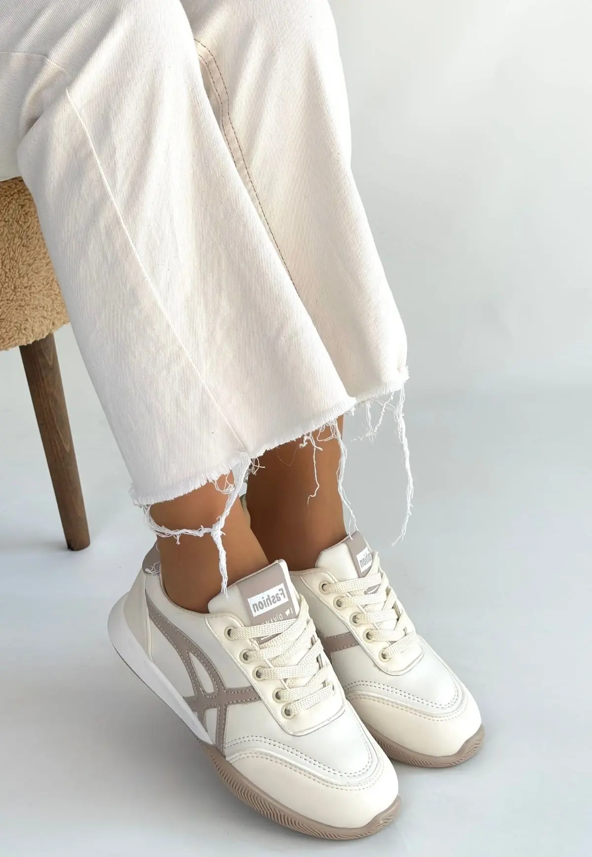 Zlay Bej Cilt Vizon Detaylı Bağcıklı Spor Ayakkabı
